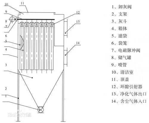 袋式除(chú)塵器本體結構(gòu)主要由上部箱體、中部箱體、下部箱(xiāng)體(灰鬥)、清灰係統和排灰機構等部分組成。