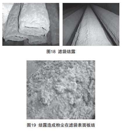 結(jié)露是袋式除塵器運行中好常見問題(如圖18), 水分是濾袋結露的好原因,造成濾袋含有水分的(de)原因 通常是低溫發生凝露,尤其在處理燃燒或高(gāo)溫煙氣(qì)時,當濾袋表麵的初始粉塵層含有水分,幹燥後就會使粉塵 凝結(jié)、板(bǎn)結(如圖19)。
