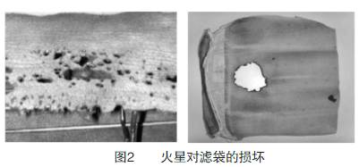除了高溫(wēn)燒毀外,煙氣中的火星對濾袋的損(sǔn)害也是非(fēi)常嚴重的。如焦爐、幹燥窯、鏈條爐、衝天爐、電爐、高爐、混(hún)鐵爐等在生產(chǎn)過程中(zhōng)會有大(dà)量(liàng)的(de)火星混入煙氣(qì)中,如對火星處理不及時,尤(yóu)其是濾袋表麵粉塵層較薄時(shí),火星就會將濾袋燒穿,形(xíng)成不規則的圓洞(如圖2)。但(dàn)當濾袋表麵粉塵層較厚時,火星不會將濾袋直接燒穿,而(ér)會(huì)造成濾袋表麵形成深顏色的烘烤痕跡。