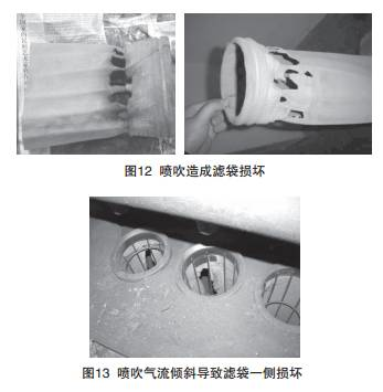 由於噴吹管(guǎn)內的氣(qì)流為橫向運行,當導流管設置(zhì)不 當時,產生的噴吹管氣(qì)流就不是垂直而是傾斜向下噴入 濾袋,就會造成袋口部(bù)位下方約300mm處產生由內向外 的破損(如圖12、13所示)。