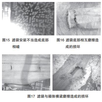 濾袋安裝不良,會由於花板、骨(gǔ)架等原因不(bú)與花板 相垂直(如圖15);如果過於偏斜就會造(zào)成濾袋(dài)底部相 互磨擦而損壞(如圖(tú)16);濾袋與壁板及(jí)濾袋與箱(xiāng)體橫 梁間也會由於磨擦而造成濾袋(dài)損壞(如圖(tú)17)。