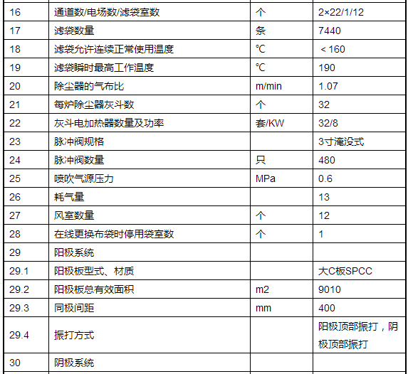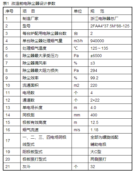 改造前,本工程配套兩台浙江電除塵器總廠(即現在菲達環保)生產(chǎn)的(de)2FAA4*37.5M*88-125型雙室四電場臥式除(chú)塵器,電除塵控製部份采用福建龍岩空氣淨化設備廠生(shēng)產的(de)GGAF02-1.0/72H型(xíng)產品,設計除塵(chén)效率≥99.2%,極板型(xíng)式為大C型板,極(jí)線型式為全部為螺旋線配輔助電極,出口設槽極板,振打方式全部采用側部饒臂錘振打(dǎ)。其一、二、三、四電場高壓供電和控製裝置是GGAJ02-1.0/72CG型的整流變壓器(qì)。本工程改造前(qián)電除塵器(qì)設計參數見表1。