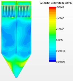 另,通(tōng)過(guò)對除塵器內部流場CFD分析對比得知,將濾袋替(tì)換為濾筒後,內部流場大為改善,大幅減少濾芯底部的衝刷,提高了使(shǐ)用壽命。在(zài)濾筒的下方區域形成較大的灰塵沉(chén)降區,利於大(dà)顆粒的預沉降,除塵效果更加優異。